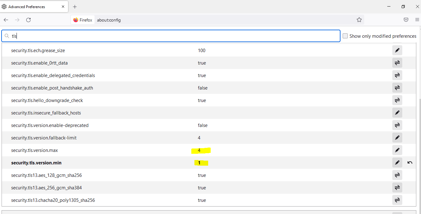 Few browsers may show TLS error for other sites if we set version=1. In that case set min.version=1 and max.version=4 and fallbak-limit=4 as shown in below screenshot